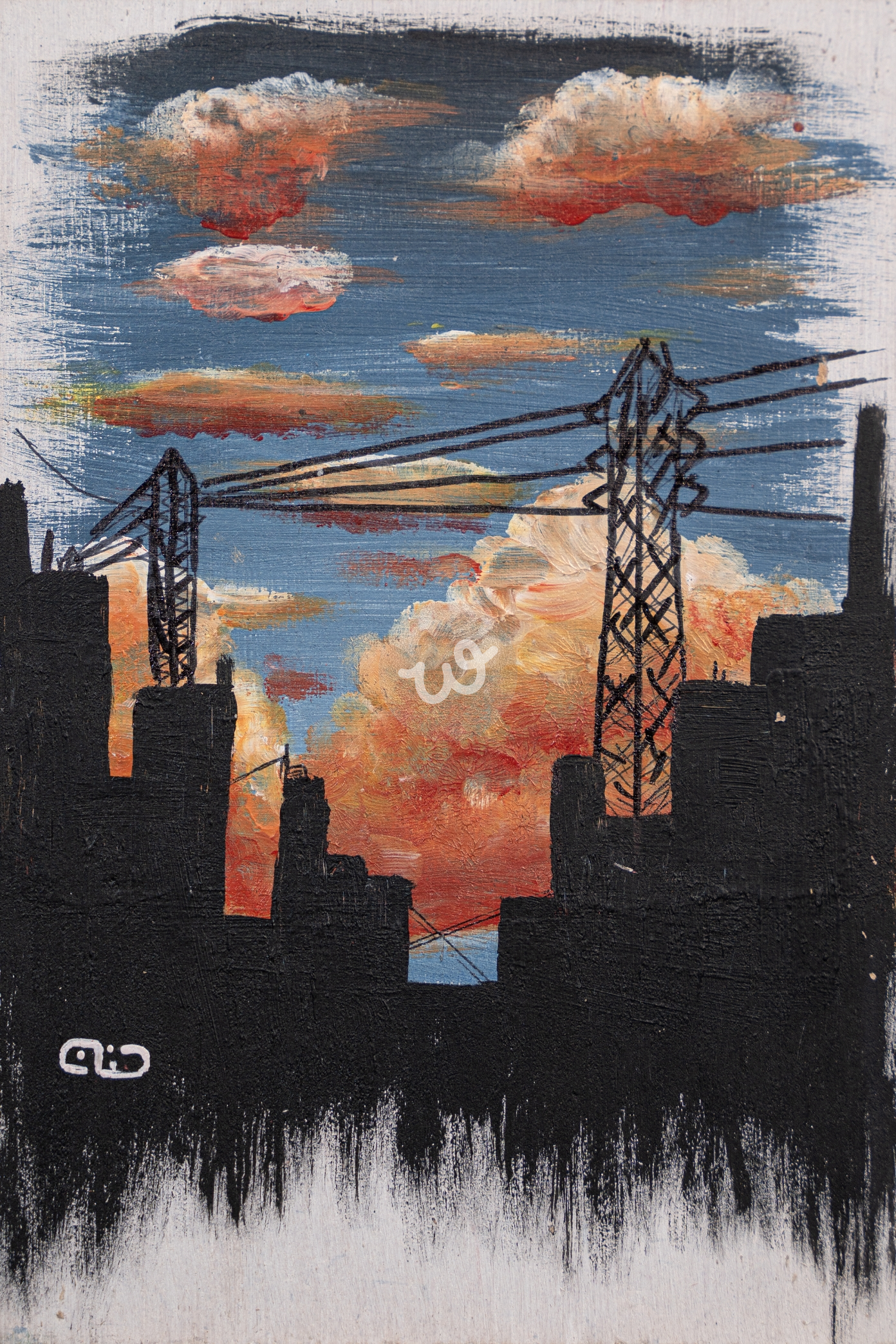 في لحظة ما قبل الغروب، يراقب الأفق التوتر بين هدوء السماء ونبض الحياة المدينة،وقبل أن يختفي الضوء تظهر السماء في لحظة سكون تام بينما تقف المباني السوداء كحارس للأفق وتظل الأسلاك تتسابق مع الزمن..رسمت بالوان اكريليك