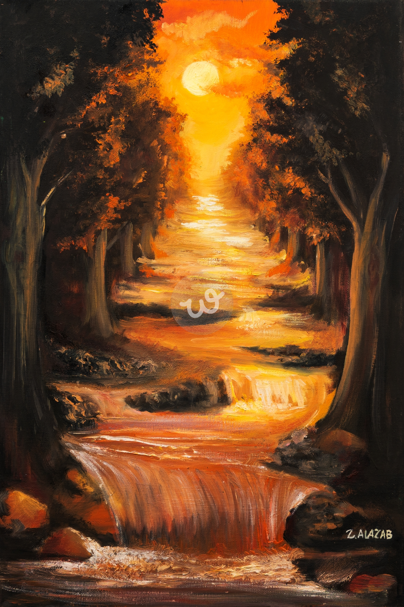 اللوحة تعبر عن سحر الطبيعة في لحظة وداع الشمس، حيث يغمر اللون البرتقالي المشهد بإحساس من الدفء والهدوء. الغابة التي تتوسطها نهر تعكس التناغم بين القوة والجمال الطبيعي، بينما يشير الغروب إلى نهاية يوم مليء بالحياة وبدء لحظة من التأمل والسكينة. النهر يعبر عن الاستمرارية وسط هذا الجمال العابر.