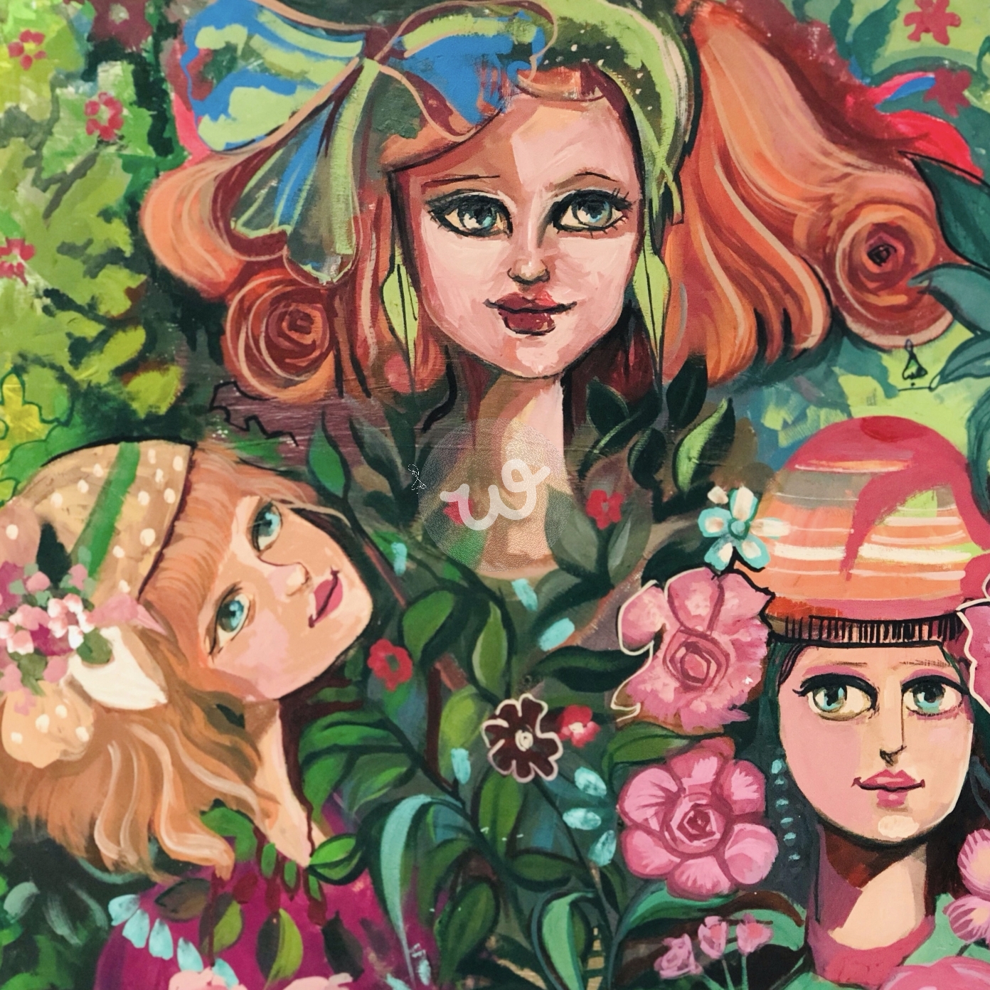 أكريليك على كانڤاس ، تصف علاقة بين أم وابنتيها حيث ان كلاهما يساهم في ازهار الآخر بطريقة رمزية وتعبيرية