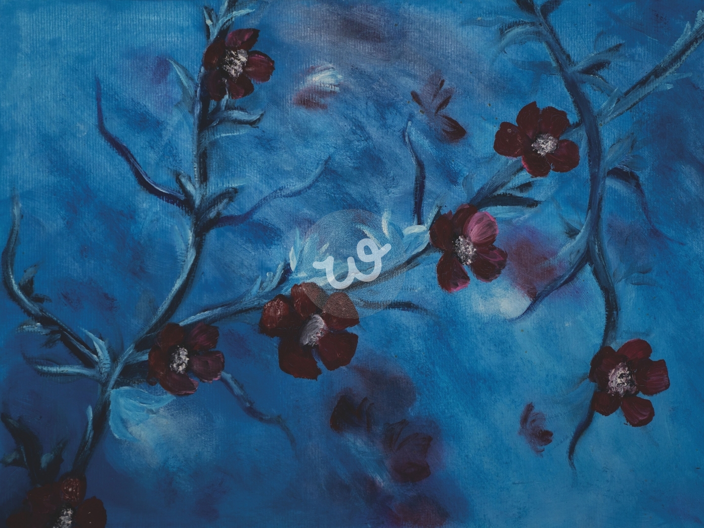 تعكس اللوحة جمال الزهور الحمراء المتفتحة على أغصان داكنة وسط خلفية زرقاء عميقة مما يضفي عليها احساسا بالغموض والسحر يخلق التباين بين الألوان الداكنة والمضيئه توازن بصريا مذهلا حيث تبدو الأزهار وكأنها تتوهج وسط السماء ديليه حالكة ضربات الفرشاة الناعمة تضيف لمسة من الحيوية والانسيابية مما يجعل اللوحة تنبض بالحياة وكأنها تروي قصة عن القوة والجمال في أحلك اللحظات