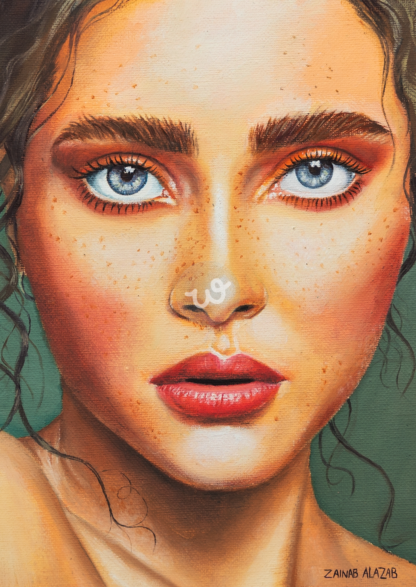 اللوحة تعكس حالة من الترقب والتفكير العميق، حيث يرمز الشعر المجعد إلى الفوضى الداخلية أو القوة الكامنة، بينما تعبير العيون الزرقاء ينقل إحساسًا بالعمق والرغبة في استكشاف المجهول