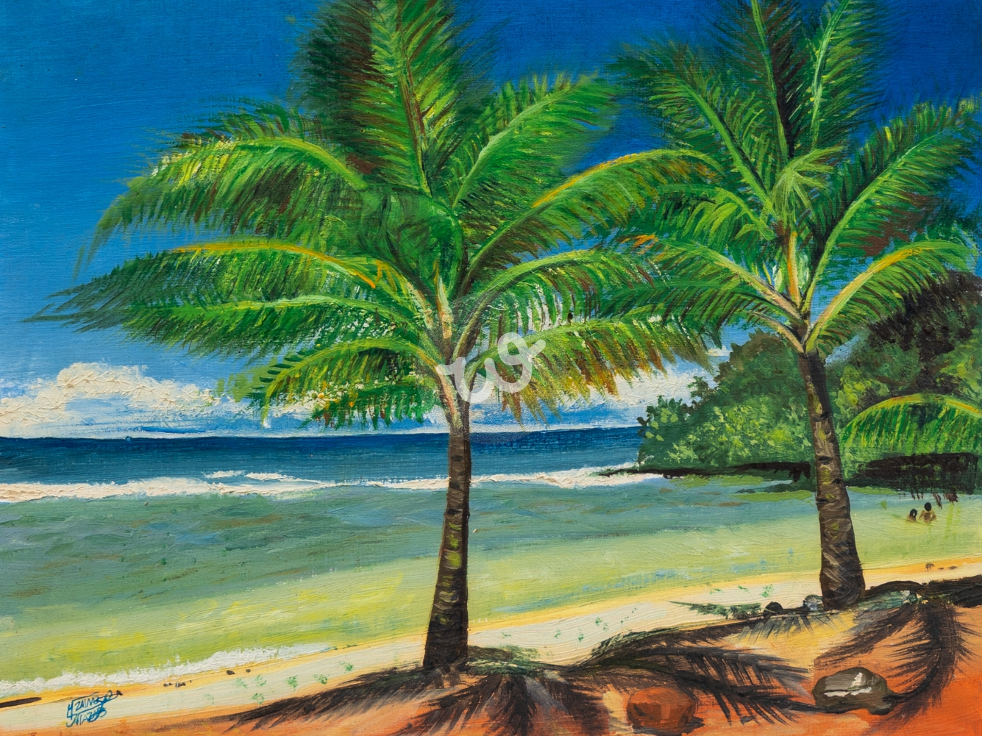 اللوحة تعبر عن جمال البساطة وهدوء الطبيعة، حيث يجسد ساحل الخوخة مع النخيل رمزًا للحياة الساحلية الغنية بالسلام والسكينة. العائلة التي تظهر من بعيد تضيف بُعدًا إنسانيًا إلى المشهد، مما يعكس ارتباط الإنسان بالطبيعة وسعادته في أحضانها. التفاصيل البعيدة ترمز إلى لحظات سعيدة قد تبدو بعيدة لكنها تترك أثرًا دائمًا