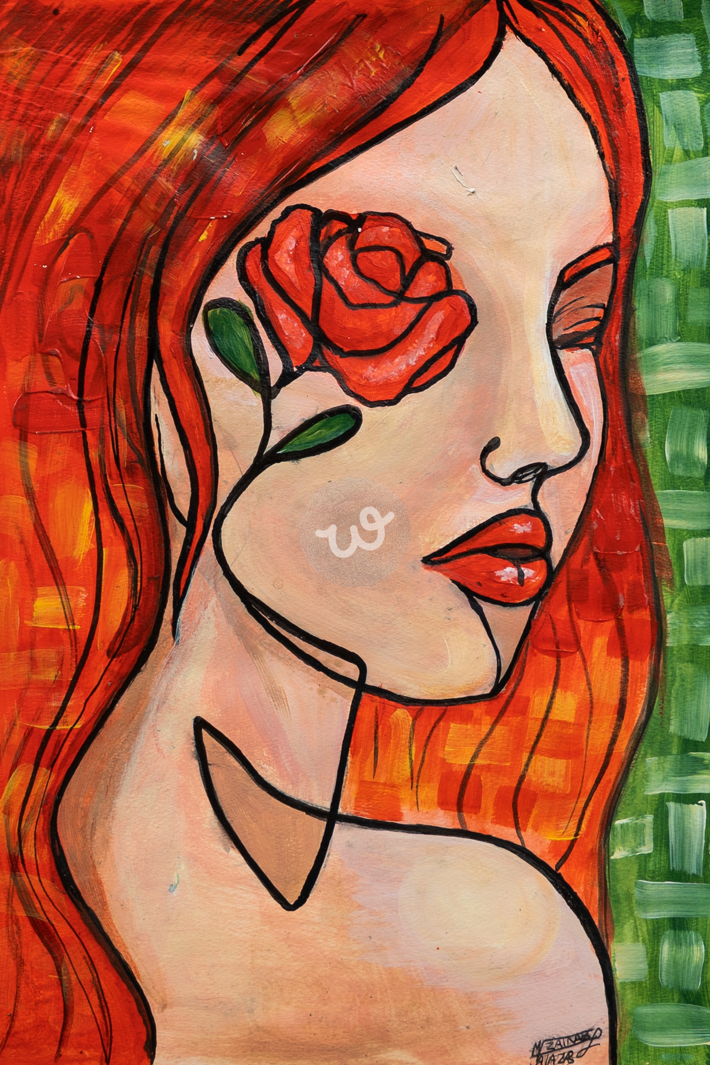 اللوحة تمثل انسجامًا بين العاطفة والجمال الداخلي، حيث يرمز الشعر الأحمر للشغف والقوة، والوردة على العين لرؤية العالم من منظور ناعم وجميل، بينما تضفي الخلفية الخضراء إحساسًا بالهدوء والتجدد، مما يعكس فكرة التوازن بين العواطف الجامحة والسلام الداخلي.