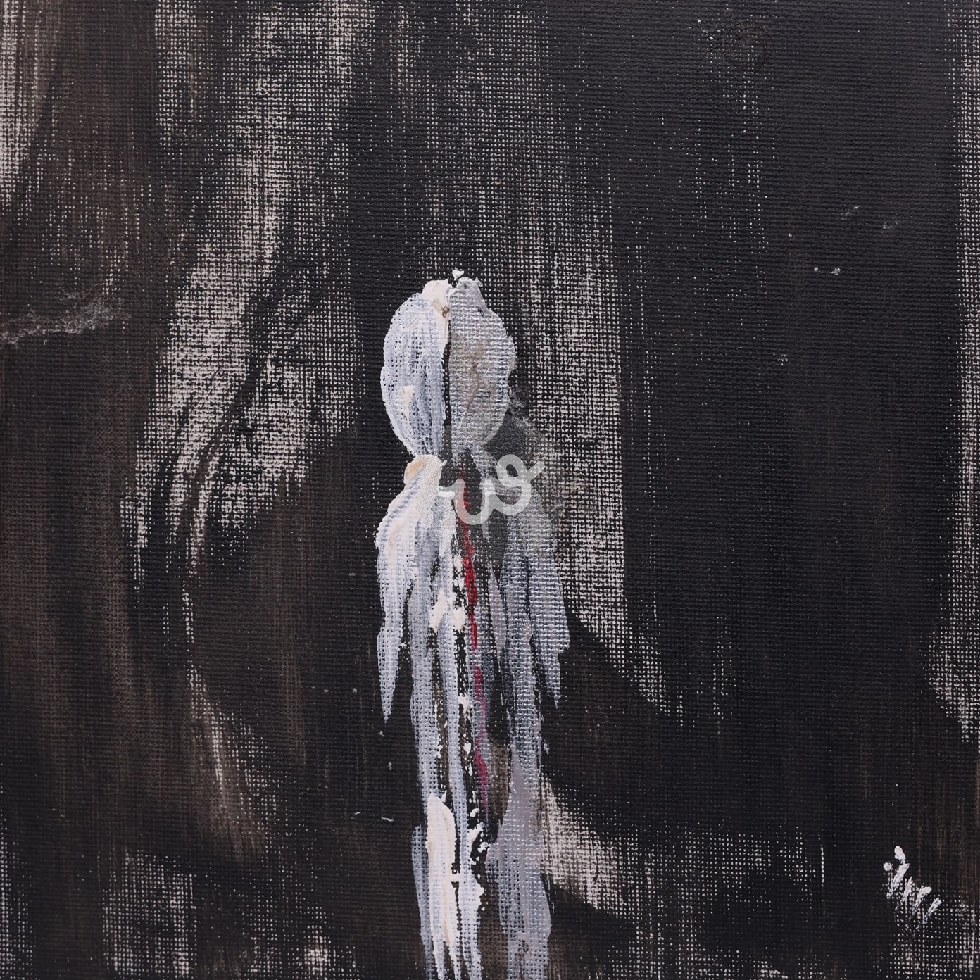 هذه اللوحة تعكس مواجهة رمزية بين النور والظلام من خلال الكائن المركزي بألوان الأبيض والأحمر والأسود الذي يبدو ثابتًا أمام الخلفية الداكنة والمشوشة. التركيز على الخطوط الحادة والألوان المحدودة يشير إلى صراع داخلي أو انعزال، بينما المساحات الداكنة المحيطة تُبرز شعورًا بالعزلة أو القوة الكامنة في الذات. العمل يثير التفكير حول الثبات في مواجهة الغموض.