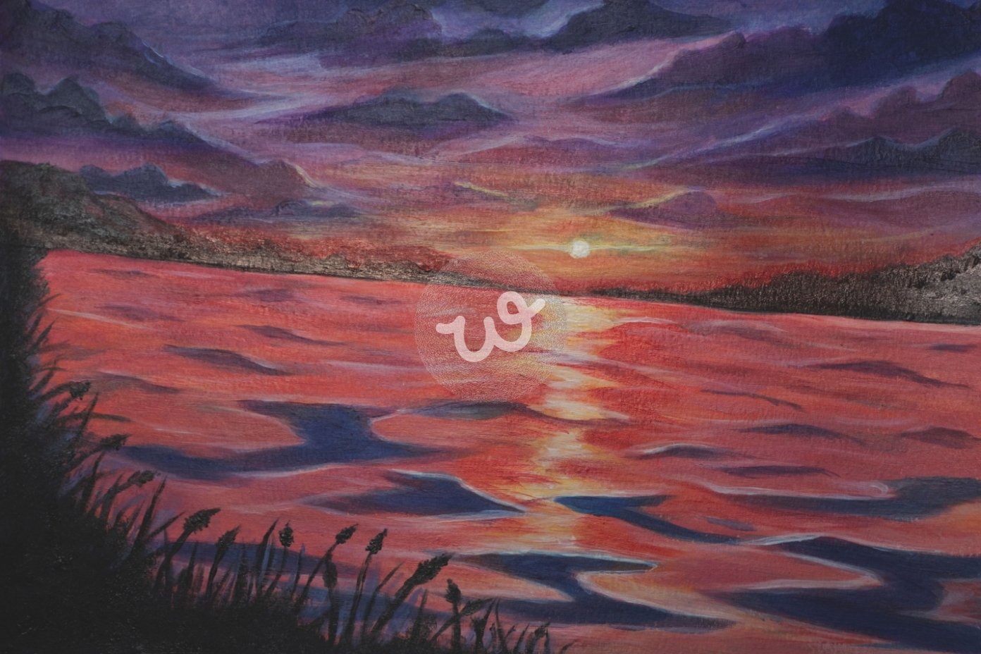 تصور اللوحة لحظة ساحرة لغروب الشمس فوق بحيرة هادئة، حيث ينعكس وهج الشمس الدافئ على سطح الماء مكونا مزيجا متناغماً من الألوان البرتقالية و الوردية والبنفسجية. تبرز الغيوم الداكنة في السماء مضيفه عمقاً درامياً للمشهد بينما تمنح الظلال الداكنة على الضفاف إحساسا بالهدوء والتأمل