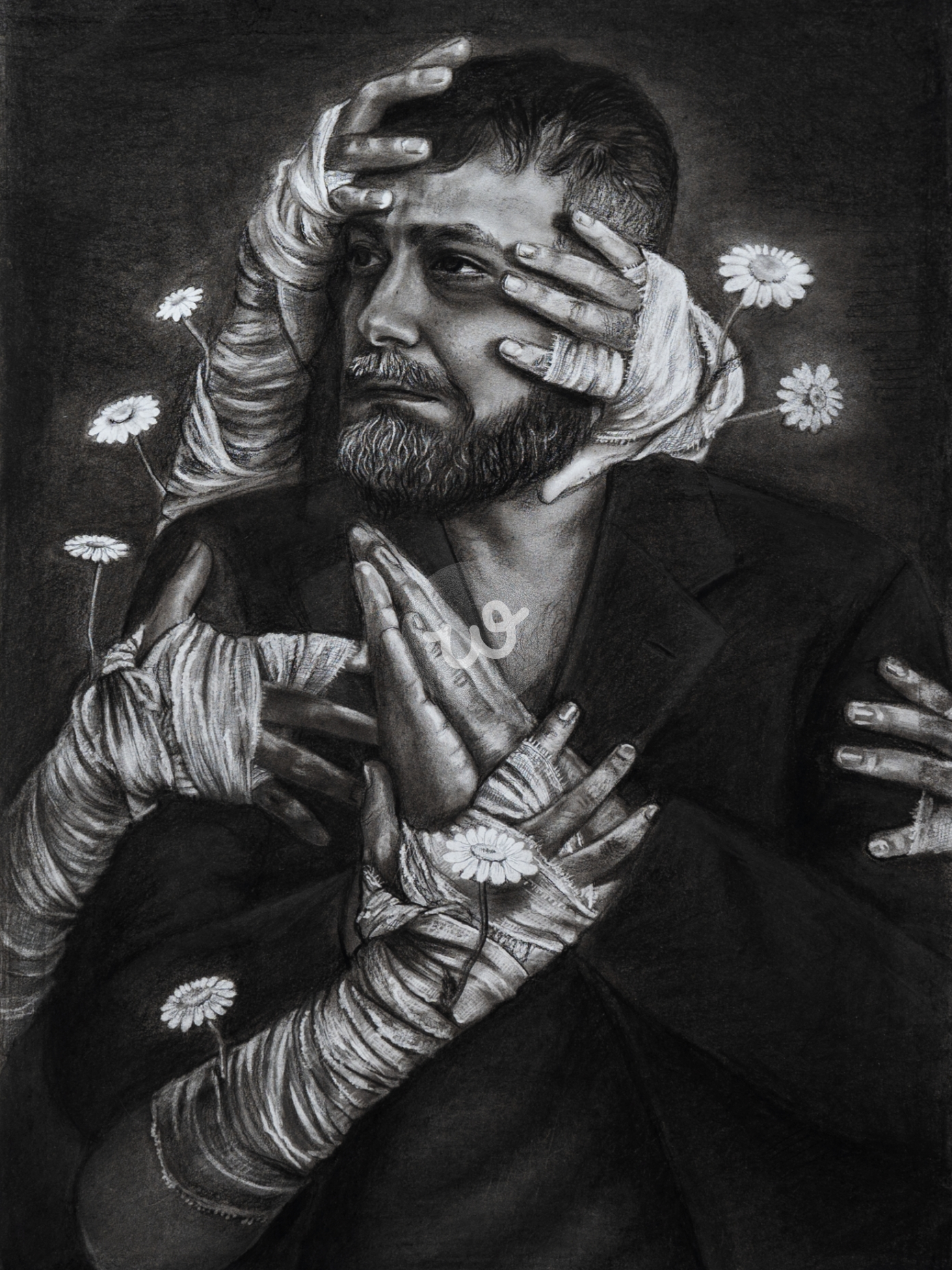 اللوحة تعبر عن لحظة من الضعف والإلحاح، حيث يرفع الرجل يديه برجاء كأنه يناشد الحياة أو الأمل رغم مشاعر العجز التي تظهر على وجهه. الأيدي الملفوفة بالشاش حوله تمثل الألم والمعاناة، بينما زهور البابونج التي تنبثق منها تشير إلى الأمل والشفاء الذي قد ينمو من وسط الألم. هذا التباين بين المعاناة والنمو يرمز إلى أن في كل لحظة ضعف، هناك إمكانية للتجدد والتعافي.