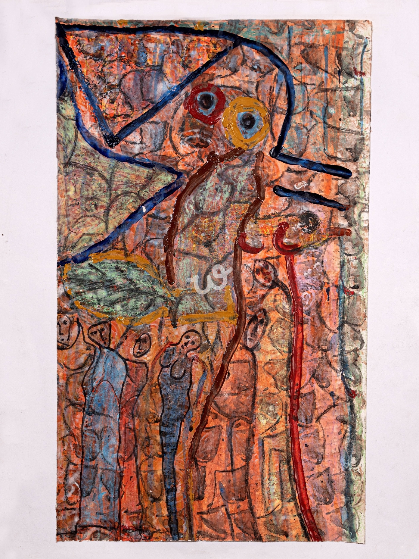 لوحة تجريدية نابضة بالحياة تعبّر عن التفاعل بين الإنسان والطبيعة من خلال أشكال تعكس الطيور والبشر. الألوان الجريئة والخلفية المعقدة تروي حكاية رمزية مليئة بالتعبير والحيوية.