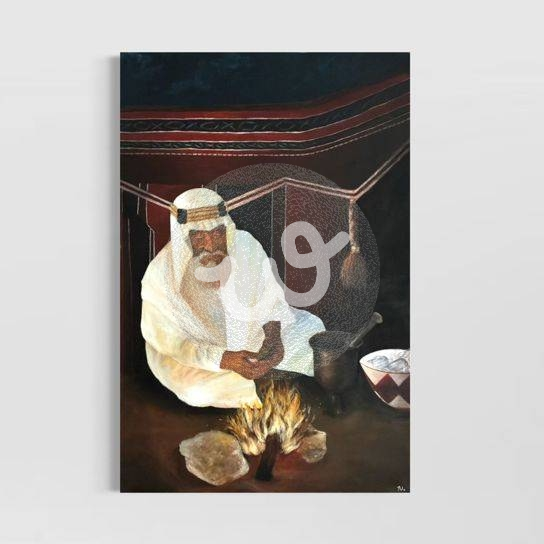 يوثّق هذا العمل لحظة إنسانية مليئة بالدفء، حيث تتجسّد الحكمة في شخصية الجد وهو جالس أمام النار. النار تمثل المعرفة المتوارثة، بينما يعبّر المشهد عن العلاقة العميقة بين الإنسان والأرض والتقاليد.