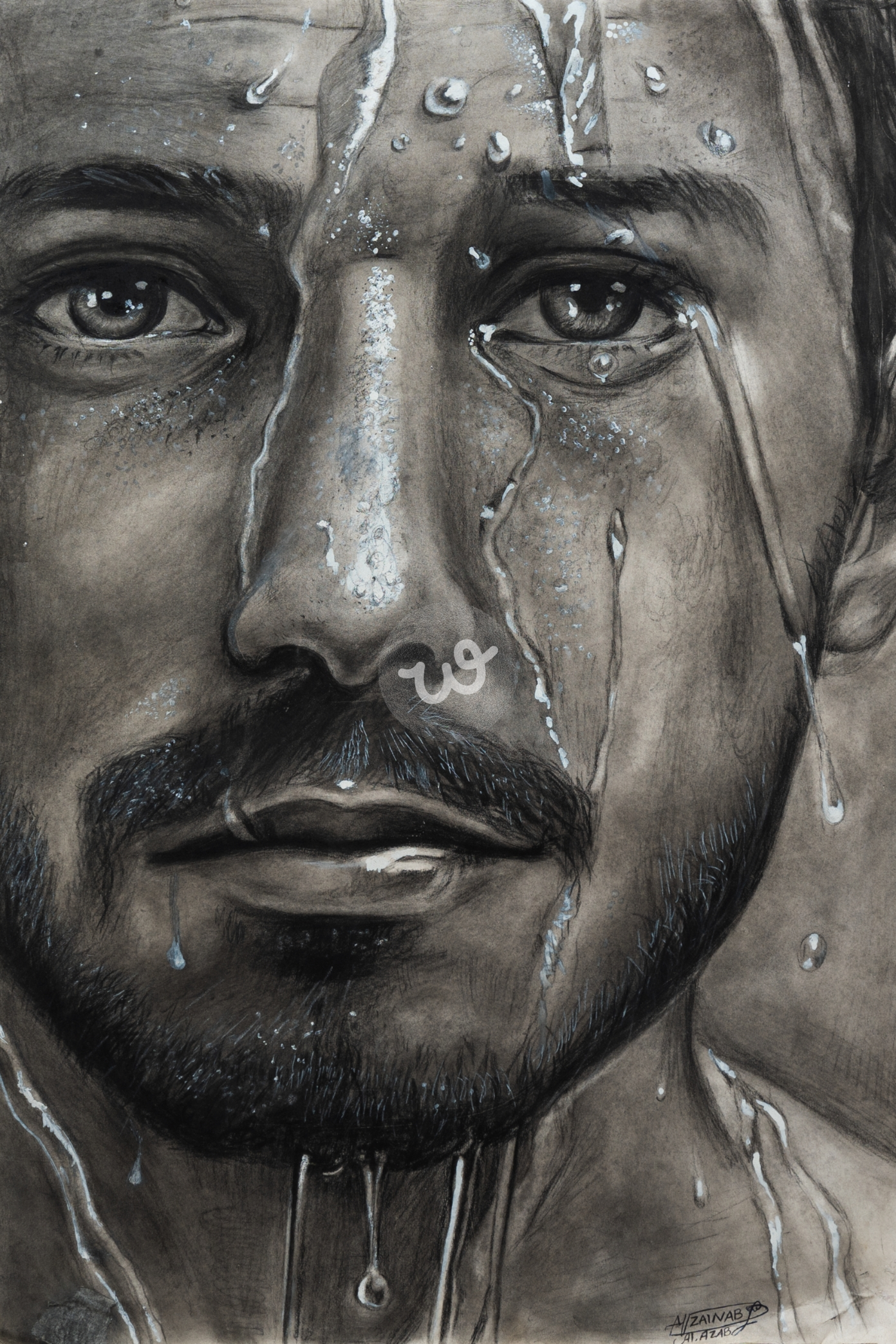اللوحة تعبر عن انصهار الألم والضعف في لحظة عاطفية عميقة، حيث يرمز الماء المتناثر على وجه الرجل إلى تجدد العواطف والآلام المتشابكة، بينما اختلاط الدموع بالمطر يشير إلى تضارب مشاعر الحزن والأمل، وكأن الطبيعة نفسها تشاركه في معاناته.
