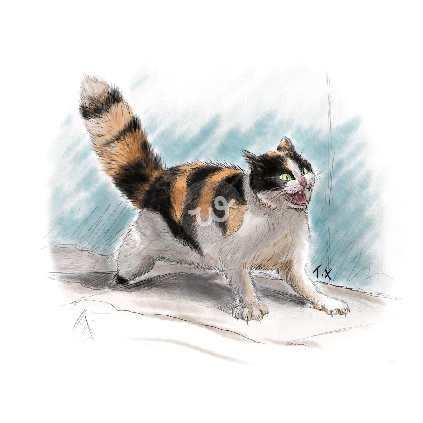 رسمة لموقف طريف لقطة برتقالية وسوداء بعيون خضراء يمكن استخدامها في اي مكان لتبعث طاقة حيوية