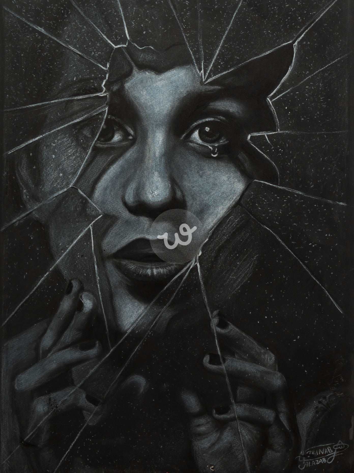اللوحة تعبر عن الصراع الداخلي بين الألم والرغبة في التحرر، حيث المرأة التي تبكي تشير إلى معاناة عميقة، بينما الزجاج المحطم يرمز إلى الحواجز النفسية أو العاطفية التي تقيدها. يدها التي تحاول لمس الزجاج بتردد تعكس محاولتها الخجولة للتواصل مع الواقع أو لتجاوز الألم، في حين يظل الزجاج عائقًا بين رغبتها في التغيير وواقعها المؤلم