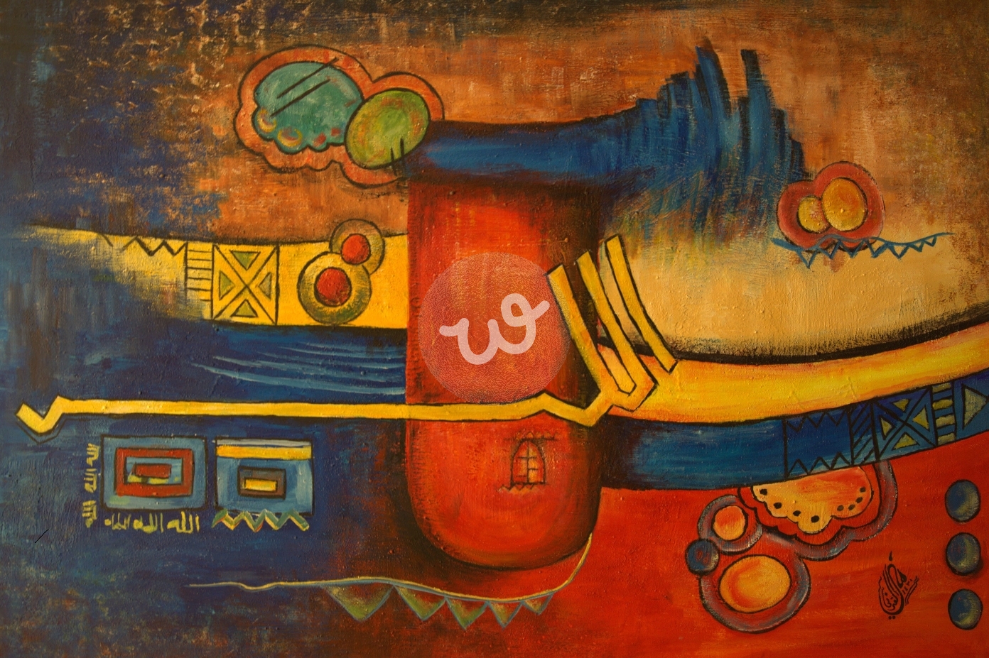 ي هذا العمل، أسعى إلى ترجمة المشاعر والتجارب الإنسانية من خلال لغة اللون والملمس، حيث يلتقي التجريد مع التعبير العاطفي في فضاء بصري يحمل أبعادًا روحانية وثقافية. تتداخل الأشكال الهندسية والخطوط المتناغمة لتخلق حالة من الانسجام والتأمل، حيث يصبح كل عنصر جزءًا من حوار بين الماضي والحاضر، بين التراث والتجديد وجود كلمة "الله" في العمل يمنحه بعدًا أعمق، حيث تتجلى الروحانية كعنصر جوهري يعكس الإيمان والتأمل في معاني الحياة. هذا الإدراج ليس مجرد تفصيل بصري، بل هو تجسيد لعلاقة الإنسان بالكون والروح