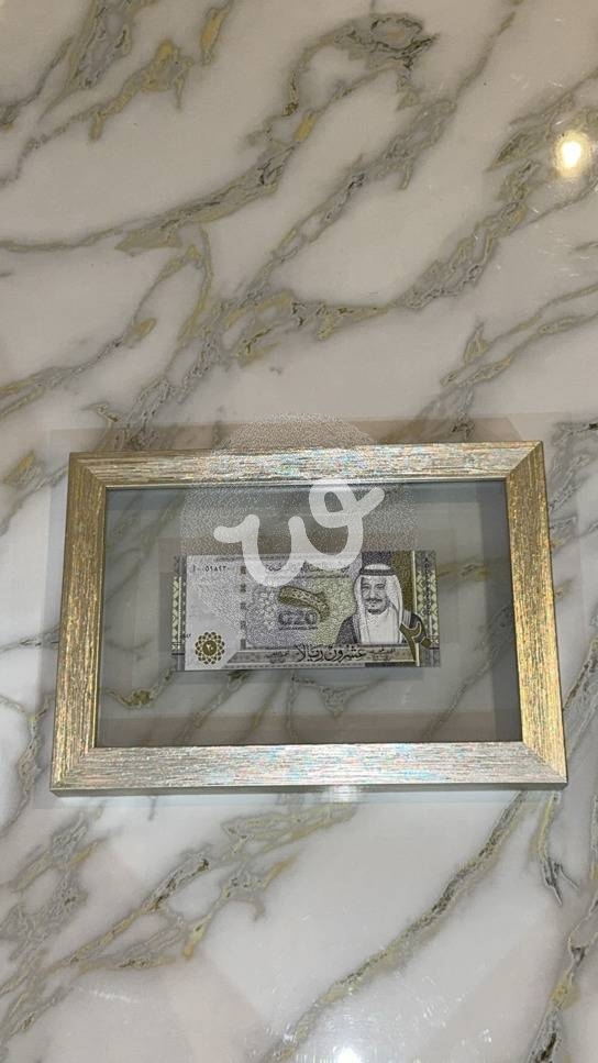 العمل عبارة عن ورقة نقدية سعودية شبه نادرة من فئة 20 ريالًا، إصدار يوثق ذكرى استضافة المملكة لمجموعة العشرين G20 لعام 2020، مؤطرة داخل إطار فضي بتصميم عصري بسيط. الورقة النقدية محاطة بالفراغ الزجاجي من جميع الجهات لتبرز وكأنها تطفر في منتصف الإطار.