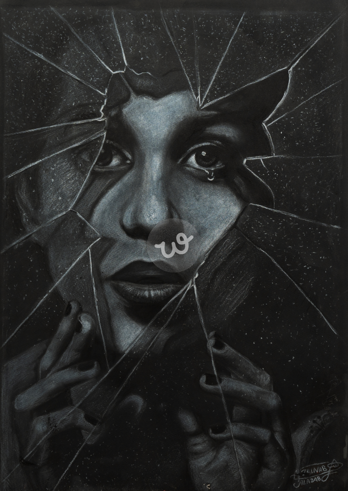 اللوحة تعبر عن الصراع الداخلي بين الألم والرغبة في التحرر، حيث المرأة التي تبكي تشير إلى معاناة عميقة، بينما الزجاج المحطم يرمز إلى الحواجز النفسية أو العاطفية التي تقيدها. يدها التي تحاول لمس الزجاج بتردد تعكس محاولتها الخجولة للتواصل مع الواقع أو لتجاوز الألم، في حين يظل الزجاج عائقًا بين رغبتها في التغيير وواقعها المؤلم