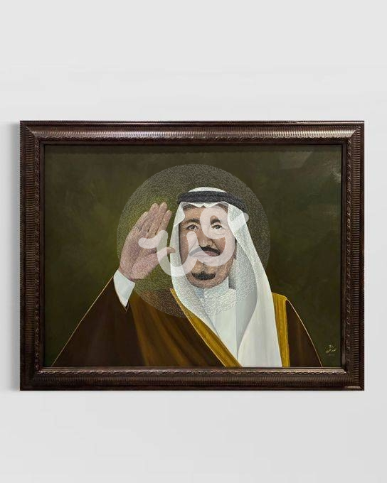 تجسد اللوحة خادم الحرمين الشريفين الملك سلمان بن عبدالعزيز وهو يرفع يده بتحية رمزية تعبّر عن السلام والقيادة. استخدمت ألوانًا دافئة وخلفية داكنة لإبراز الهيبة والوقار، مع إضاءة تركز على الوجه واليد لتوحّد بين القوة والإنسانية في شخصية القائد.