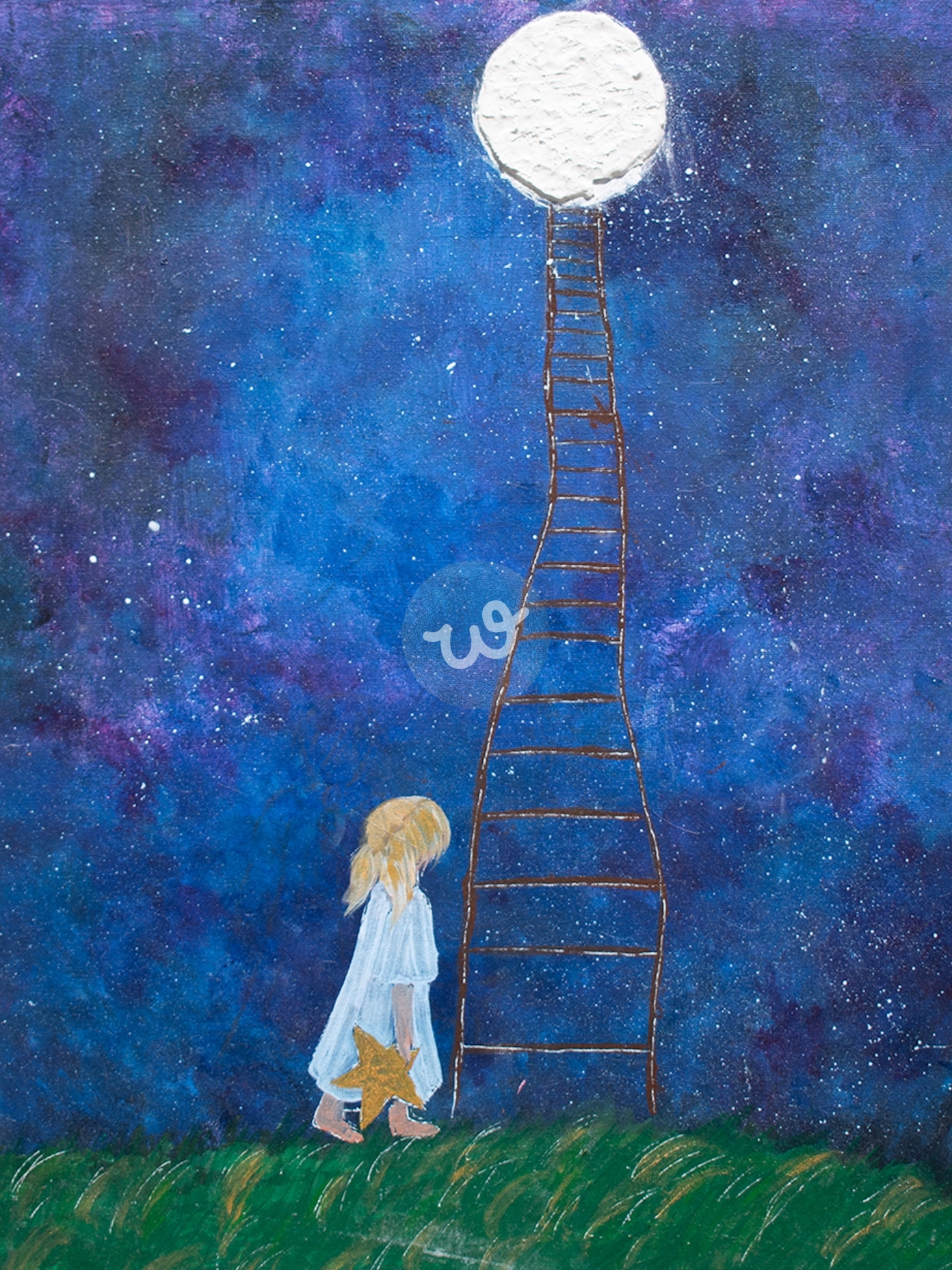 تصور هذه اللوحة مشهدًا حالماً لطفلة صغيرة تسير على العشب الأخضر، حاملة نجمة ذهبية بين يديها، بينما تتجه نحو سلم نحيف يمتد صعودًا إلى القمر الساطع في سماء الليل العميقة. الخلفية تتألق بدرجات الأزرق والبنفسجي، مما يخلق جوًا من الغموض والخيال، وكأن الفتاة في رحلة نحو الأحلام أو تحقيق المستحيل. التعبير البصري في اللوحة يعكس الإصرار والبراءة، حيث تبدو الطفلة وكأنها تستعد لصعود السلم، وكأنها تسعى للوصول إلى القمر أو تحقيق أمل بعيد. تضيف بساطة التفاصيل وسحر الألوان لمسة من الحنين والتأمل.