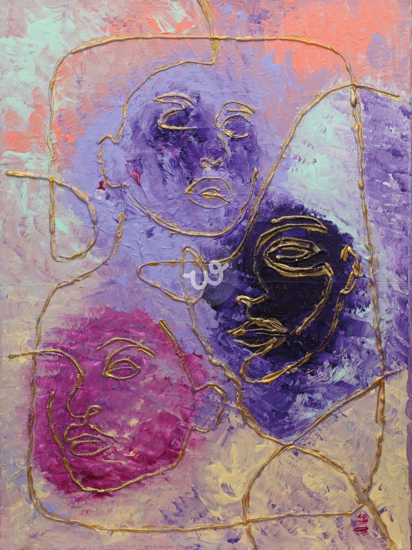 الأشكال المتداخلة في اللوحة قد تمثل القوى المختلفة التي تؤثر على حياة المرأة من العلاقات الأسرية والاجتماعية إلى التحديات المهنية والشخصية. الخطوط الذهبية التي تربط الأشكال يمكن أن ترمز إلى الروابط العاطفية والفكرية التي تدعم المرأة، مثل الدعم الذي تحصل عليه من الأصدقاء والأسرة، وأيضًا الضغوط التي تواجهها لتلبية توقعات المجتمع.