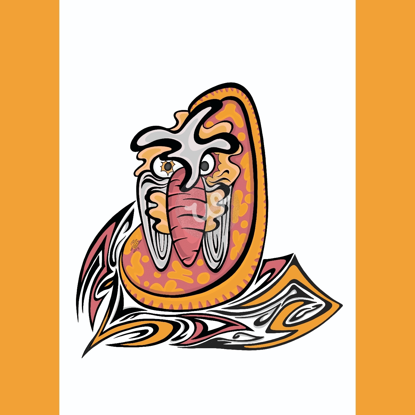 أرنب يُركز نظره إلى الأمام. لأُذنيه تفاصيل كالسجاد وتحيط به خطوط زُخرفية.